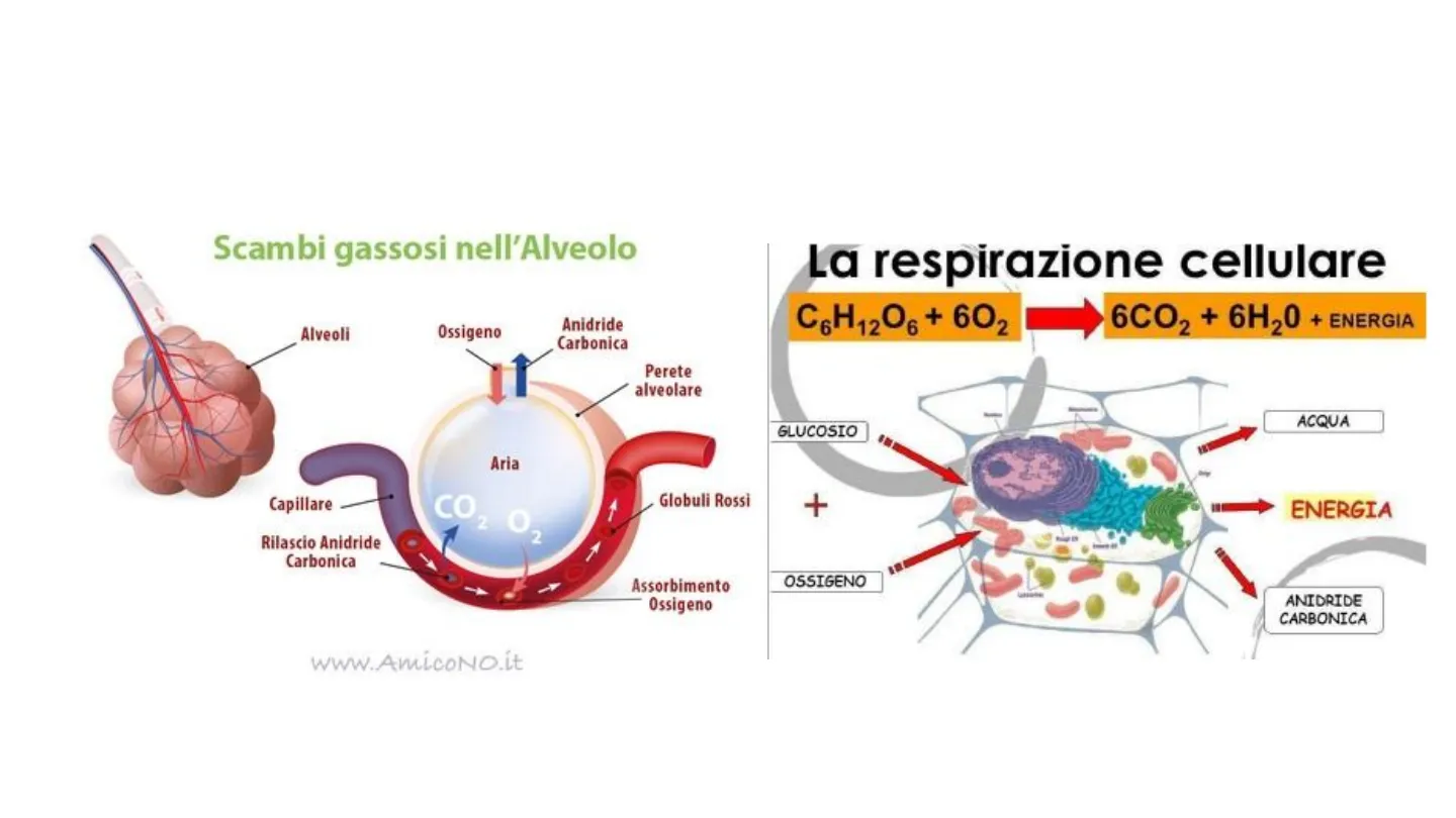 La RESPIRAZIONE è il processo con cui l'organismo assume ossigeno dall'ambiente (respirazione polmonare) e lo trasporta alle cellule (respirazione cellulare), mentre recupera anidride carbonica dalle cellule e la libera all'esterno.