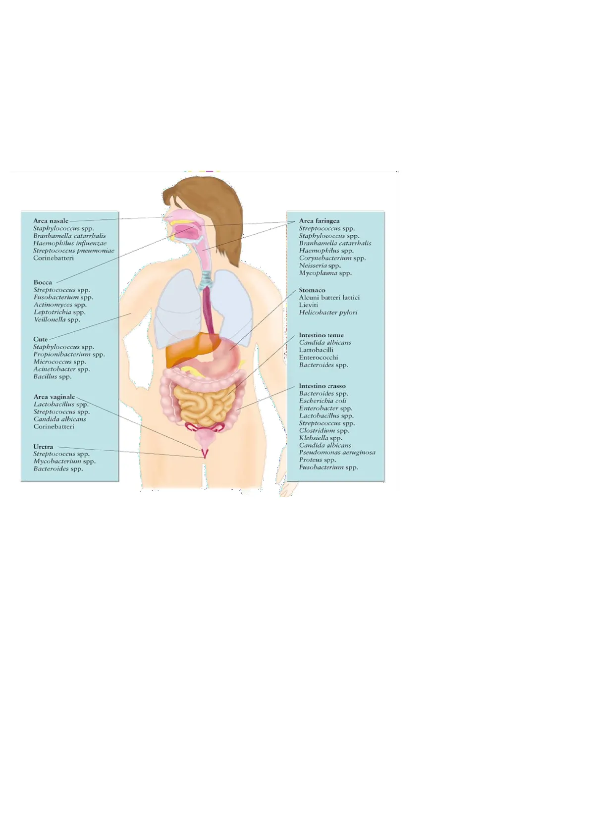 La popolazione microbica residente detta microbiota si trova in tutte le parti a contatto con l'ambiente esterno (aria, cibo, acqua) ricco di microrganismi perché noi non viviamo in un ambiente sterile. Il corpo umano è sterile solo alla nascita perché la placenta è un'ottima barriera e poi va incontro a colonizzazione al momento del parto e successivi cambiamenti nel microbiota nel corso della vita (cambiamenti fisiologici o patologici). Nel nostro corpo vi sono due distretti: