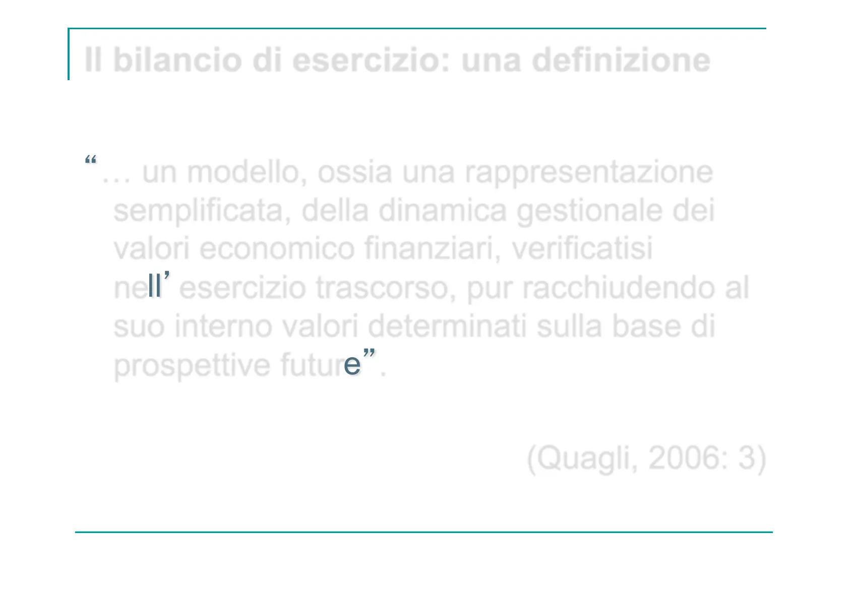 1Il bilancio di esercizio: una definizione "... un modello, ossia una rappresentazione semplificata, della dinamica gestionale dei valori economico finanziari, verificatisi nell' esercizio trascorso, pur racchiudendo al suo interno valori determinati sulla base di prospettive future". (Quagli, 2006: 3)