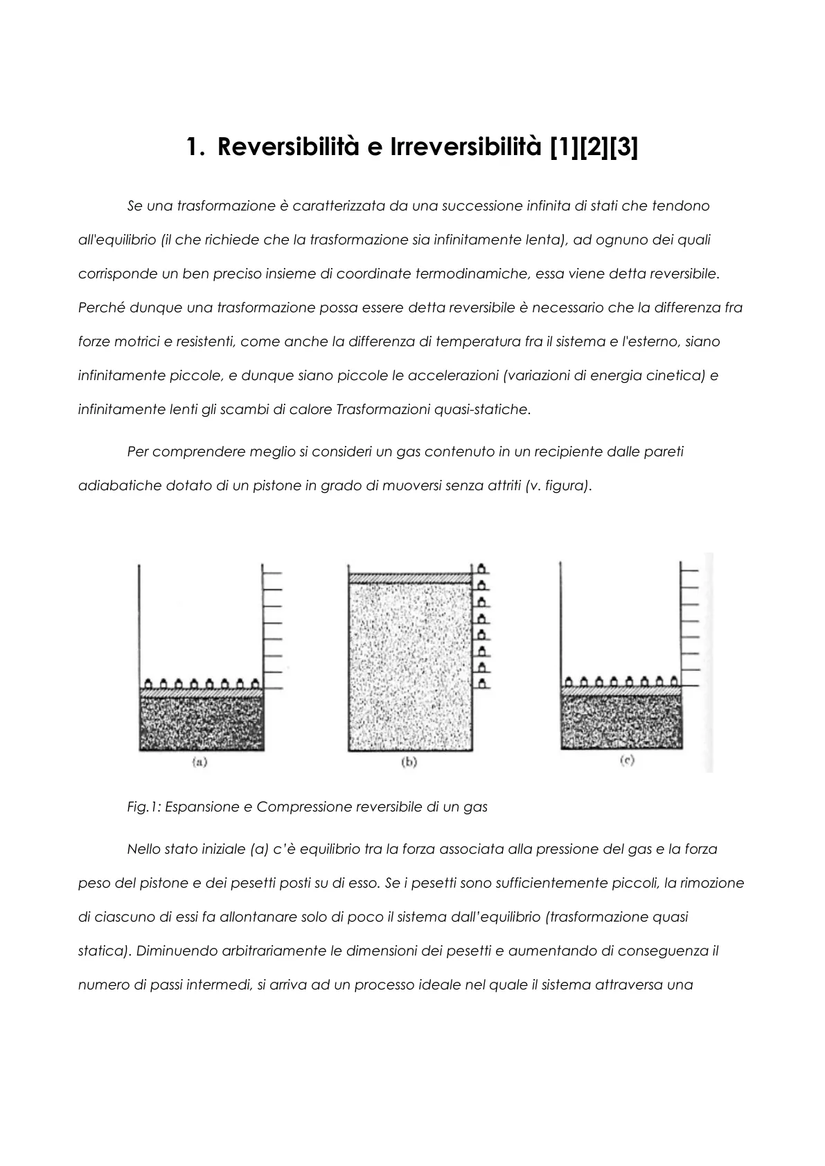 1. Reversibilità e Irreversibilità [1][2][3] Se una trasformazione è caratterizzata da una successione infinita di stati che tendono all'equilibrio (il che richiede che la trasformazione sia infinitamente lenta), ad ognuno dei quali corrisponde un ben preciso insieme di coordinate termodinamiche, essa viene detta reversibile. Perché dunque una trasformazione possa essere detta reversibile è necessario che la differenza fra forze motrici e resistenti, come anche la differenza di temperatura fra il sistema e l'esterno, siano infinitamente piccole, e dunque siano piccole le accelerazioni (variazioni di energia cinetica) e infinitamente lenti gli scambi di calore Trasformazioni quasi-statiche. Per comprendere meglio si consideri un gas contenuto in un recipiente dalle pareti adiabatiche dotato di un pistone in grado di muoversi senza attriti (v. figura).