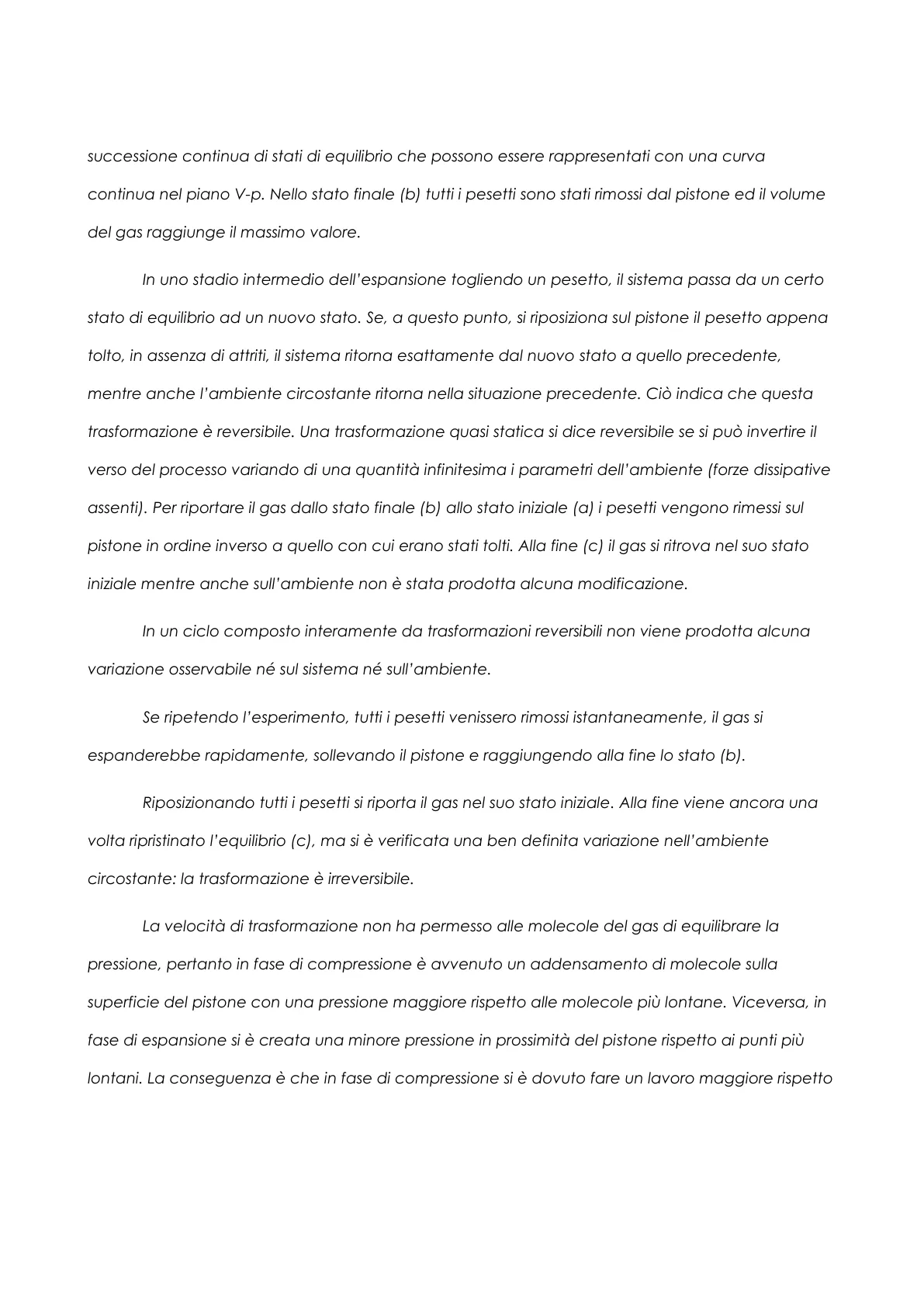 {a) (b) (c) Fig. 1: Espansione e Compressione reversibile di un gas Nello stato iniziale (a) c'è equilibrio tra la forza associata alla pressione del gas e la forza peso del pistone e dei pesetti posti su di esso. Se i pesetti sono sufficientemente piccoli, la rimozione di ciascuno di essi fa allontanare solo di poco il sistema dall'equilibrio (trasformazione quasi statica). Diminuendo arbitrariamente le dimensioni dei pesetti e aumentando di conseguenza il numero di passi intermedi, si arriva ad un processo ideale nel quale il sistema attraversa unasuccessione continua di stati di equilibrio che possono essere rappresentati con una curva continua nel piano V-p. Nello stato finale (b) tutti i pesetti sono stati rimossi dal pistone ed il volume del gas raggiunge il massimo valore. In uno stadio intermedio dell'espansione togliendo un pesetto, il sistema passa da un certo stato di equilibrio ad un nuovo stato. Se, a questo punto, si riposiziona sul pistone il pesetto appena tolto, in assenza di attriti, il sistema ritorna esattamente dal nuovo stato a quello precedente, mentre anche l'ambiente circostante ritorna nella situazione precedente. Ciò indica che questa trasformazione è reversibile. Una trasformazione quasi statica si dice reversibile se si può invertire il verso del processo variando di una quantità infinitesima i parametri dell'ambiente (forze dissipative assenti). Per riportare il gas dallo stato finale (b) allo stato iniziale (a) i pesetti vengono rimessi sul pistone in ordine inverso a quello con cui erano stati tolti. Alla fine (c) il gas si ritrova nel suo stato iniziale mentre anche sull'ambiente non è stata prodotta alcuna modificazione. In un ciclo composto interamente da trasformazioni reversibili non viene prodotta alcuna variazione osservabile né sul sistema né sull'ambiente. Se ripetendo l'esperimento, tutti i pesetti venissero rimossi istantaneamente, il gas si espanderebbe rapidamente, sollevando il pistone e raggiungendo alla fine lo stato (b). Riposizionando tutti i pesetti si riporta il gas nel suo stato iniziale. Alla fine viene ancora una volta ripristinato l'equilibrio (c), ma si è verificata una ben definita variazione nell'ambiente circostante: la trasformazione è irreversibile. La velocità di trasformazione non ha permesso alle molecole del gas di equilibrare la pressione, pertanto in fase di compressione è avvenuto un addensamento di molecole sulla superficie del pistone con una pressione maggiore rispetto alle molecole più lontane. Viceversa, in fase di espansione si è creata una minore pressione in prossimità del pistone rispetto ai punti più lontani. La conseguenza è che in fase di compressione si è dovuto fare un lavoro maggiore rispettoa quello riottenuto in fase di espansione. La differenza tra i due lavori è nelle perdite dovute ai fenomeni di irreversibilità quali l'attrito. Pertanto l'affermazione che dopo una trasformazione un sistema ritorni nello stato iniziale non è di per sé indice di reversibilità: affinché il processo sia reversibile, è necessario che anche l'ambiente, in tutte le sue parti, sia riportato nello stato iniziale. Ne consegue che, quando si verifica un insieme ciclico di processi reversibili, non vi è alcun modo per accorgersi se questi processi siano avvenuti o meno. Al contrario, tutti i processi irreversibili lasciano inevitabilmente traccia di sé: se il sistema, al termine del processo, ritorna nelle condizioni iniziali, allora c'è almeno una parte dell'ambiente per la quale questo ritorno non è stato possibile. A titolo di esempio, anche in una macchina non termica, il rendimento è sempre minore dell'unità a causa dei fenomeni parassitari che implicano la trasformazione in calore di una parte, se pur modesta, di energia di prima specie; questa parte non può più essere riconvertita integralmente in energia di prima specie, in virtù dell'enunciato di Carnot del Secondo Principio. Ciò significa che, in tali macchine, si sono svolti processi irreversibili e la causa di irreversibilità è costituita dai fenomeni parassitari. Non è mai capitato, fino ad oggi, di osservare alcun processo fisico reversibile: tutte le trasformazioni che avvengono nella realtà sono in qualche misura, sia pur piccola, irreversibili; sono cioè dotate, come si dice, di un certo grado di irreversibilità. Numerose sono le cause d'irreversibilità: una prima causa sono i fenomeni parassitari; una seconda è l'attrito viscoso e l'eventuale turbolenza nel moto dei fluidi; una terza causa sono le trasmissioni interne di calore, connesse con le disuniformità di temperatura all'interno di un corpo che scambia calore con l'esterno; una quarta causa è il mescolamento di due sistemi inizialmente separati, come quando, ad esempio, si mescolano due fasi semplici per costituire una fase complessa.Fatta eccezione per il caso del mescolamento, si può osservare che il grado di irreversibilità aumenta con la rapidità delle trasformazioni. È noto che l'attrito meccanico è proporzionale alla velocità relativa degli organi in movimento, ed anche nel caso del deflusso dei fluidi si ha un incremento notevole delle perdite per attrito con la velocità, sia in regime viscoso che turbolento. Nel riscaldamento di un corpo, infine, gli squilibri interni di temperatura sono tanto più vistosi quanto più rapido è il riscaldamento. Per quanto riportato si può affermare che soltanto le trasformazioni quasi statiche possono, a rigore, rappresentarsi con una linea sui diagrammi termodinamici. Infatti, durante una trasformazione che avviene in tempo finito, c'è squilibrio all'interno del sistema; pertanto il sistema non può, istante per istante, essere rappresentato da un solo punto del piano termodinamico: ad ogni valore di una delle grandezze di stato riportate sul diagramma, corrispondono infatti infiniti valori dell'altra, relativi agli infiniti elementi di volume del sistema. Ad esempio, con riferimento alla fig. 2, ad ogni val