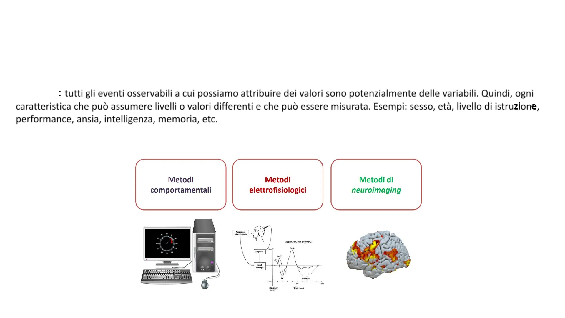 Per indagare mente e comportamento è necessario misurare i fenomeni di interesse. L'operazione di misurazione presuppone che ciò che misuriamo vari (ovvero possa assumere valori diversi). Misuriamo quindi delle variabili Variabile: tutti gli eventi osservabili a cui possiamo attribuire dei valori sono potenzialmente delle variabili. Quindi, ogni caratteristica che può assumere livelli o valori differenti e che può essere misurata. Esempi: sesso, età, livello di istruzione, performance, ansia, intelligenza, memoria, etc.