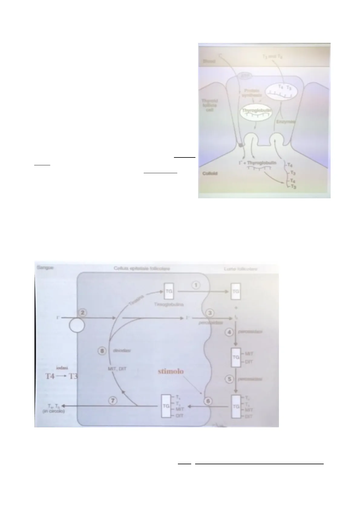Sangue Cellula epiteliale follicolare Lume folicotant 1 TG Tic Tireoglobulina 2 3 r pevolpidas 4 perossidasi 8 delodası - MIT TG -DIT Todasi MIT, DIT stimolo T4-T3 5 |porosskdasi - T. -T. 7 6 TG - MIT T. T. + (in circolo) - MIT . DIT - DIT