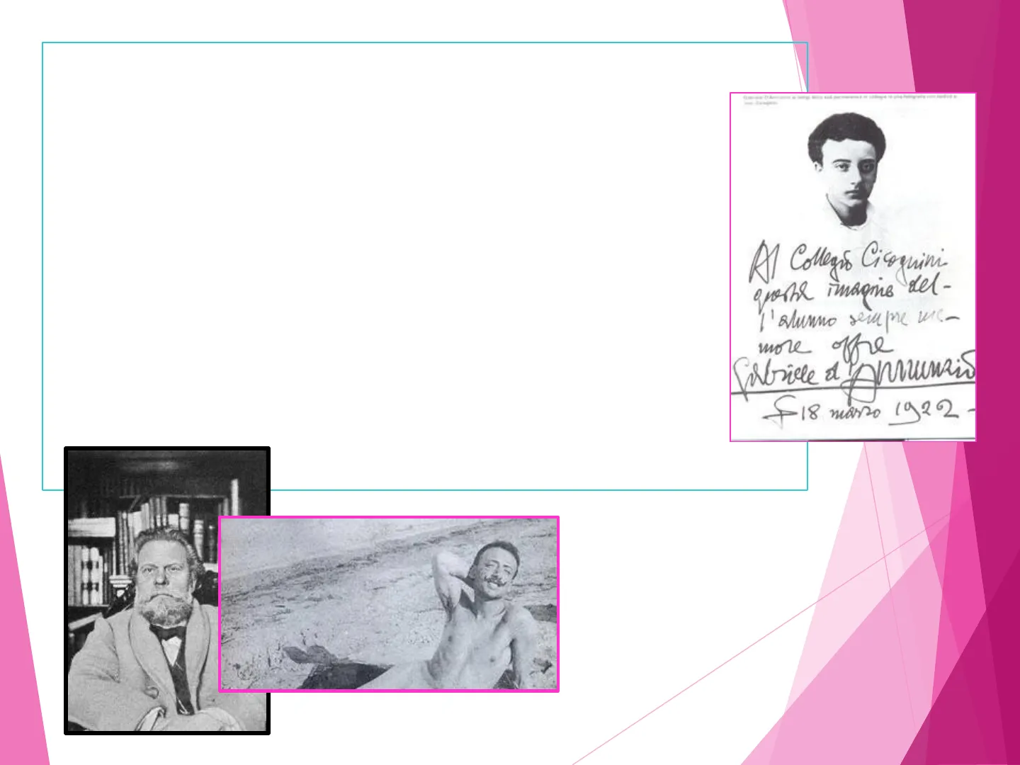Al Collegio Cicognini grosse imagine del- l'alunno sempre ma- more offre 18 marzo 1922 Primo vere Intermezzo di rime Narra dei suoi primi amori e viene giudicata cosa indecentissima da Carducci, massimo poeta dell'epocaLa sua vita viene costruita in vista dell'effetto sul pubblico; agisce come i personaggi di un'opera d'arte: si spiegano così molti colpi di testa della sua esistenza, come le improvvise prese di posizione politica, gli eroismi di guerra, lo scandalo di alcuni amori vissuti pubblicamente e trascritti nei suoi libri. Non agisce mai spontaneamente tutto è progettato per stupire e restare sulla cresta dell'onda, e infatti fu un vero divo dell'epoca, conosciuto in tutta Europa. Attraverso una maschera che finge di indossare (= rifiuta inorridito la mediocrità borghese e si rifugia in un mondo di pura arte, accettando come regola di vita solo il bello), D'Annunzio si auto esclude dalla società, ma poi utilizza i mezzi della società di massa per celebrare le sue opere.Nel 1881 è a Roma dove si iscrive all'università, che abbandonò presto perché cominciò a frequentare i salotti mondani (high life) Si fa conoscere come scrittore diventa giornalista di cronaca mondana D "una miserabile fatica quotidiana" per sostentarsi Frequenta i migliori salotti e conduce una vita eccentrica Era spesso inseguito dai creditori e cercava vari mezzi per evitarli. Divenuto famoso erano nati collezionisti di suoi manoscritti, spesso apocrifi perché il vate ne produceva più copie per trarne più soldi In seguito alla relazione con Eleonora Duse (iniziata nel 1897), nel 1898 si trasferisce a Firenze, dove vive in una villa detta "La Capponcina", dove spese parte dei suoi avere per lavori di ristrutturazione, arredamento, allevamento di cani e cavalli, regali folli all'amante. La pirgia nel pineto. Zaci. Su le soglie del bosco non odo parole che dici unione und odo parole più nuove che provino gocciole e foglie lontane . Avolta. Fiore dalle nuvole sparse. Piove su le tamerici salmastre es une, piove mi fine Maglion & inti ,Sperimentò tutte le forme e i generi letterari per rincorrere i desideri del pubblico e le tendenze letterarie del momento, assimilando le novità provenienti dall'Europa "o reinventarsi, o morire" E' stato il nostro autore più aperto alla modernità perché ha voluto conoscere e provare nelle sue opere le teorie delle correnti culturali a lui contemporanee. Si rivolse anche al teatro proprio perché poteva raggiungere un più vasto pubblico Nel 1910, a causa dei creditori inferociti, fu costretto a fuggire dall'Italia e a rifugiarsi in Francia. Anche in questo caso si adattò, scrivendo opere teatrali in francese Tornò in Italia allo scoppio del PRIMO CONFLITTO MONDIALE. Iniziò un'intensa campagna interventista, che ebbe un peso notevole nello spingere l'Italia in guerra, galvanizzando l'opinione pubblica.
