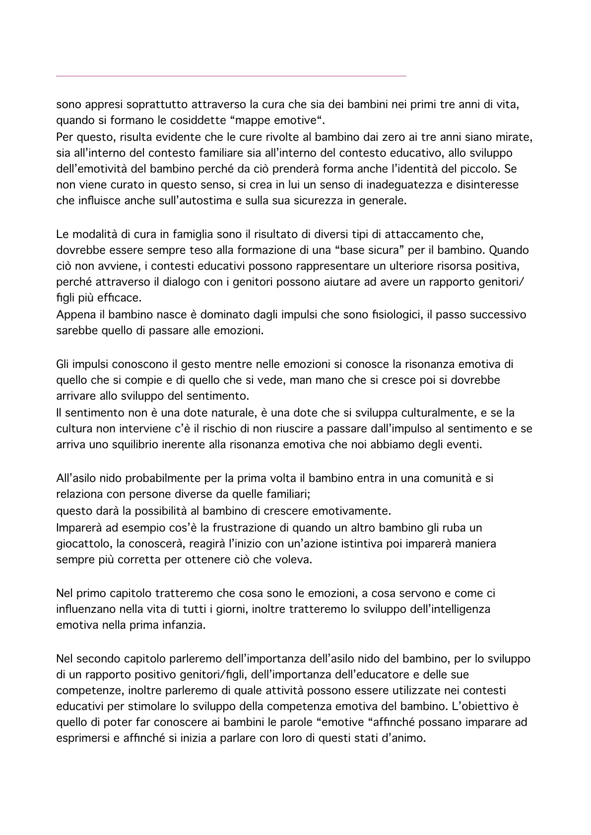 Nel secondo capitolo parleremo dell'importanza dell'asilo nido del bambino, per lo sviluppo di un rapporto positivo genitori/figli, dell'importanza dell'educatore e delle sue competenze, inoltre parleremo di quale attività possono essere utilizzate nei contesti educativi per stimolare lo sviluppo della competenza emotiva del bambino. L'obiettivo è quello di poter far conoscere ai bambini le parole "emotive "affinché possano imparare ad esprimersi e affinché si inizia a parlare con loro di questi stati d'animo.