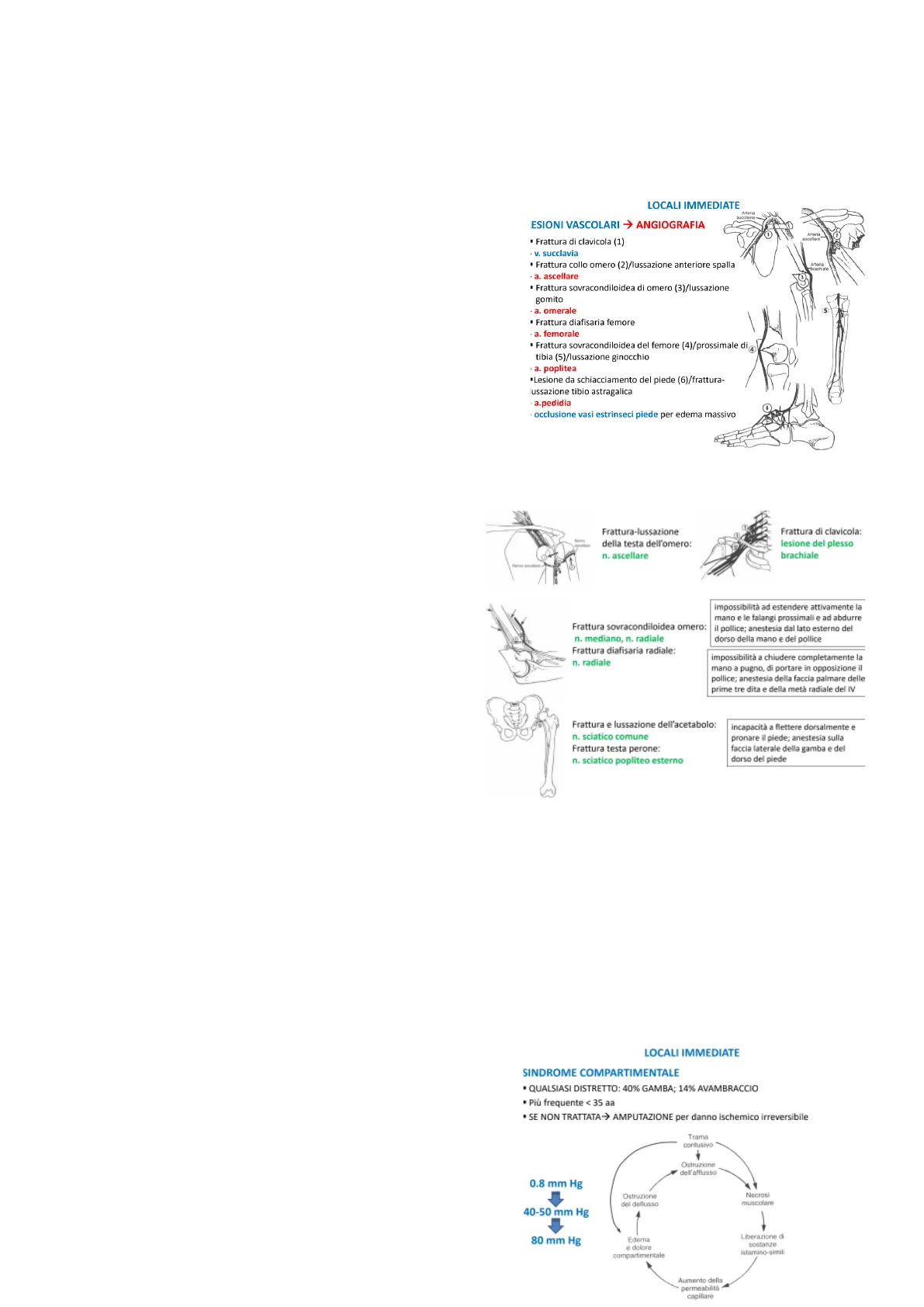 LOCALI IMMEDIATE 10 giorni è probabile che le lesioni siano irreversibili. SINDROME COMPARTIMENTALE Sindrome compartimentale È un aumento di pressione all'interno di uno spazio limitato. L'insulto traumatico, la stasi e l'edema che si forma, provocano un aumento progressivo della pressione che Trama contusivo Ostruzione dell'afflusso 0.8 mm Hg Necrosi muscolare 40-50 mm Hg - 80 mm Hg Edema e dolore compartimentale Liberazione di sostanze istamino-simili Aumento della permeabilità capillare 2 · QUALSIASI DISTRETTO: 40% GAMBA; 14% AVAMBRACCIO · Più frequente < 35 aa . SE NON TRATTATA-> AMPUTAZIONE per danno ischemico irreversibile Ostruzione del deflusso Arteria ascellare Frattura sovracondiloidea omero: n. mediano, n. radiale Frattura diafisaria radiale: n. radialeLOCALI IMMEDIATE comprime primariamente le strutture vascolari venose, perché hanno minore pressione al loro interno, poi anche quelle arteriose causando necrosi ischemica dei tessuti muscolare e osseo. L'aumento di pressione lede anche le strutture nervose. Il pz arriva in ps con cute tesa poi lignea, pallida, parestetica e fa fatica a muovere le dita dell'arto leso, facendogli muovere l'arto prova molto dolore.