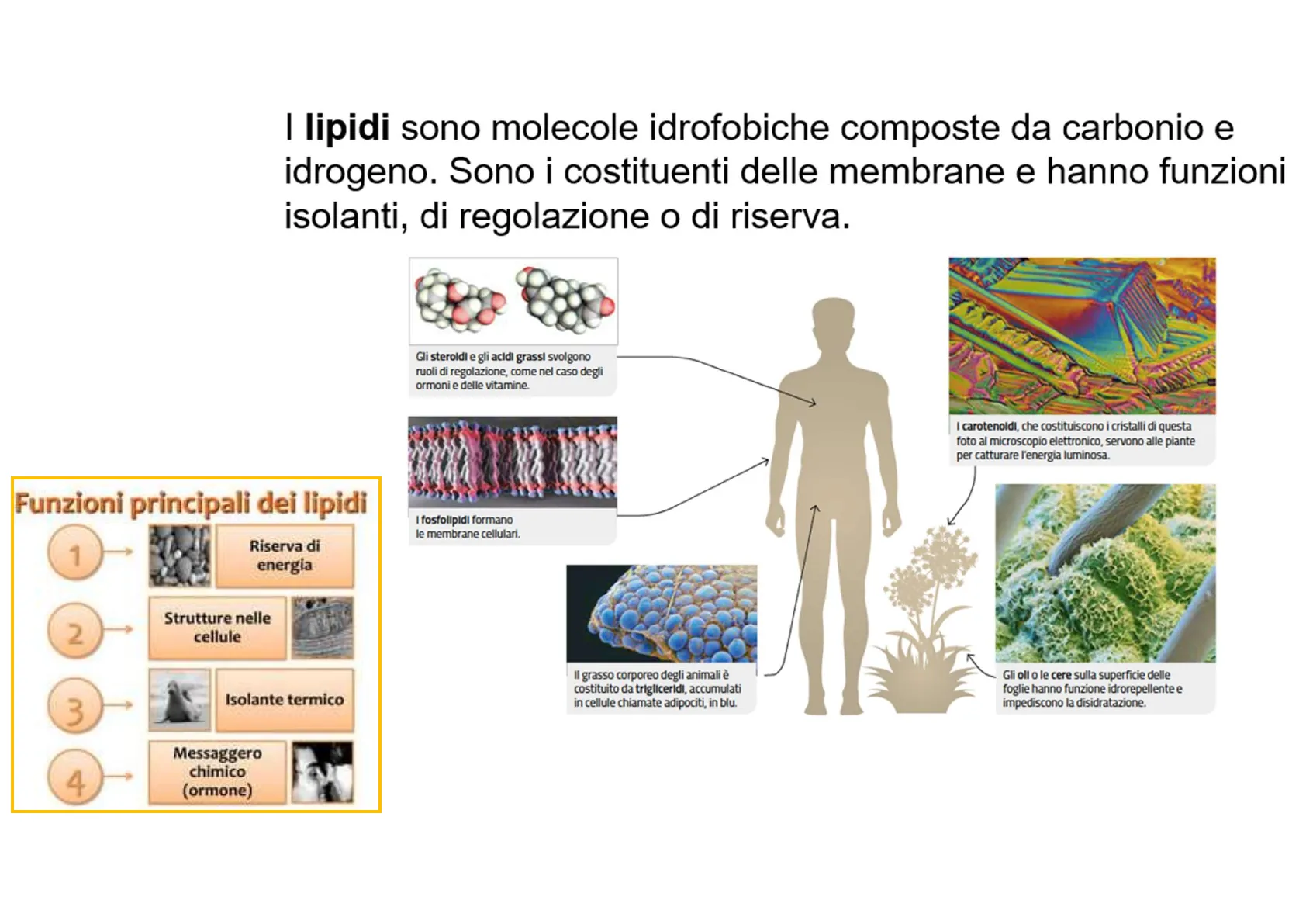 I fosfolipidi formano le membrane cellulari. Il grasso corporeo degli animali è costituito da trigliceridi, accumulati in cellule chiamate adipociti, in blu. Gli oll o le cere sulla superficie delle foglie hanno funzione idrorepellente e impediscono la disidratazione.