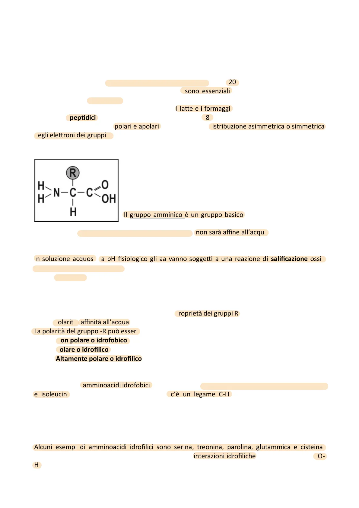 Gli amminoacidi sono i monomeri costituenti le proteine, sono 20 ordinari che costituiscono le proteine (standard, primari). Alcuni amminoacidi sono essenziali dal punto di vista nutrizionale perché non sono sintetizzarti dal nostro organismo, quindi, devono essere introdotti con la dieta. Alimenti ricchi di amminoacidi essenziali come il latte e i formaggi. I legami tra i vari amminoacidi sono detti peptidici. Gli amminoacidi essenziali sono 8 e vengono indotti con la dieta, gli amminoacidi si dividono in polari e apolari a secondo della distribuzione asimmetrica o simmetrica degli elettroni dei gruppi R.