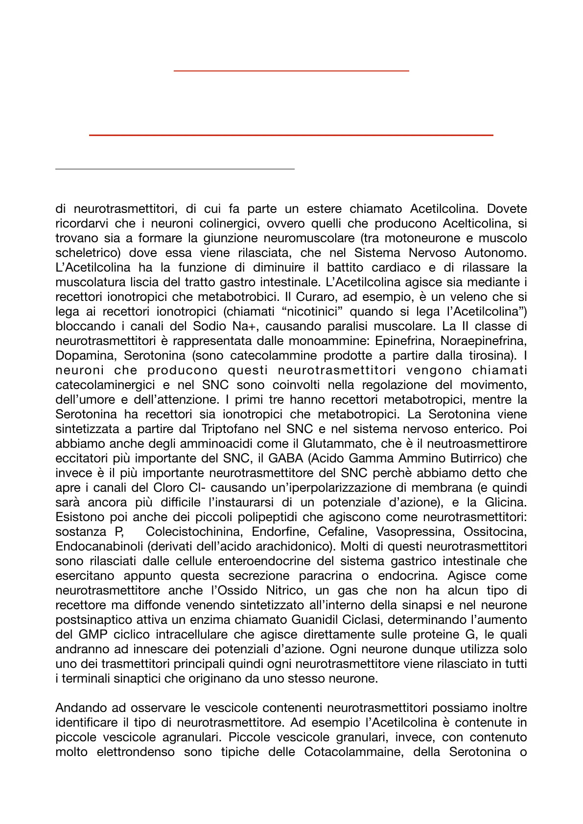 Abbiamo diverse tipologie di neurotrasmettitori. Questa tabella vi mostra la I classe di neurotrasmettitori, di cui fa parte un estere chiamato Acetilcolina. Dovete ricordarvi che i neuroni colinergici, ovvero quelli che producono Acelticolina, si trovano sia a formare la giunzione neuromuscolare (tra motoneurone e muscolo scheletrico) dove essa viene rilasciata, che nel Sistema Nervoso Autonomo. L'Acetilcolina ha la funzione di diminuire il battito cardiaco e di rilassare la muscolatura liscia del tratto gastro intestinale. L'Acetilcolina agisce sia mediante i recettori ionotropici che metabotrobici. Il Curaro, ad esempio, è un veleno che si lega ai recettori ionotropici (chiamati "nicotinici" quando si lega l'Acetilcolina") bloccando i canali del Sodio Na+, causando paralisi muscolare. La II classe di neurotrasmettitori è rappresentata dalle monoammine: Epinefrina, Noraepinefrina, Dopamina, Serotonina (sono catecolammine prodotte a partire dalla tirosina). I neuroni che producono questi neurotrasmettitori vengono chiamati catecolaminergici e nel SNC sono coinvolti nella regolazione del movimento, dell'umore e dell'attenzione. I primi tre hanno recettori metabotropici, mentre la Serotonina ha recettori sia ionotropici che metabotropici. La Serotonina viene sintetizzata a partire dal Triptofano nel SNC e nel sistema nervoso enterico. Poi abbiamo anche degli amminoacidi come il Glutammato, che è il neutroasmettirore eccitatori più importante del SNC, il GABA (Acido Gamma Ammino Butirrico) che invece è il più importante neurotrasmettitore del SNC perchè abbiamo detto che apre i canali del Cloro CI- causando un'iperpolarizzazione di membrana (e quindi sarà ancora più difficile l'instaurarsi di un potenziale d'azione), e la Glicina. Esistono poi anche dei piccoli polipeptidi che agiscono come neurotrasmettitori: sostanza P, Colecistochinina, Endorfine, Cefaline, Vasopressina, Ossitocina, Endocanabinoli (derivati dell'acido arachidonico). Molti di questi neurotrasmettitori sono rilasciati dalle cellule enteroendocrine del sistema gastrico intestinale che esercitano appunto questa secrezione paracrina o endocrina. Agisce come neurotrasmettitore anche l'Ossido Nitrico, un gas che non ha alcun tipo di recettore ma diffonde venendo sintetizzato all'interno della sinapsi e nel neurone postsinaptico attiva un enzima chiamato Guanidil Ciclasi, determinando l'aumento del GMP ciclico intracellulare che agisce direttamente sulle proteine G, le quali andranno ad innescare dei potenziali d'azione. Ogni neurone dunque utilizza solo uno dei trasmettitori principali quindi ogni neurotrasmettitore viene rilasciato in tutti i terminali sinaptici che originano da uno stesso neurone.