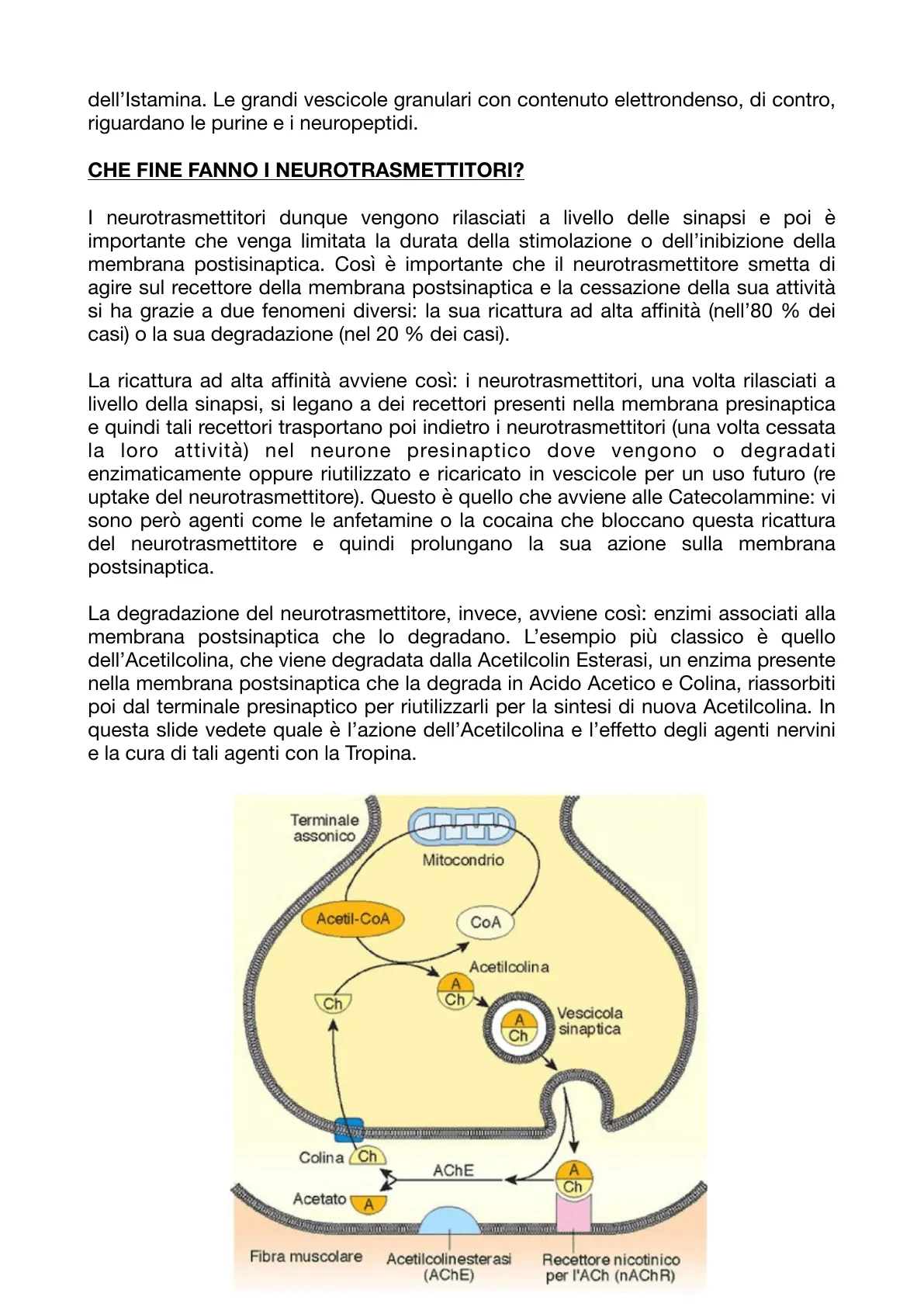Terminale assonico Mitocondrio Acetil-CoA CoA Acetilcolina A Ch Ch A Ch Vescicola sinaptica Colina Ch AChE A Ch Acetato A Fibra muscolare Acetilcolinesterasi (AChE) Recettore nicotinico per l'ACh (nAChR)