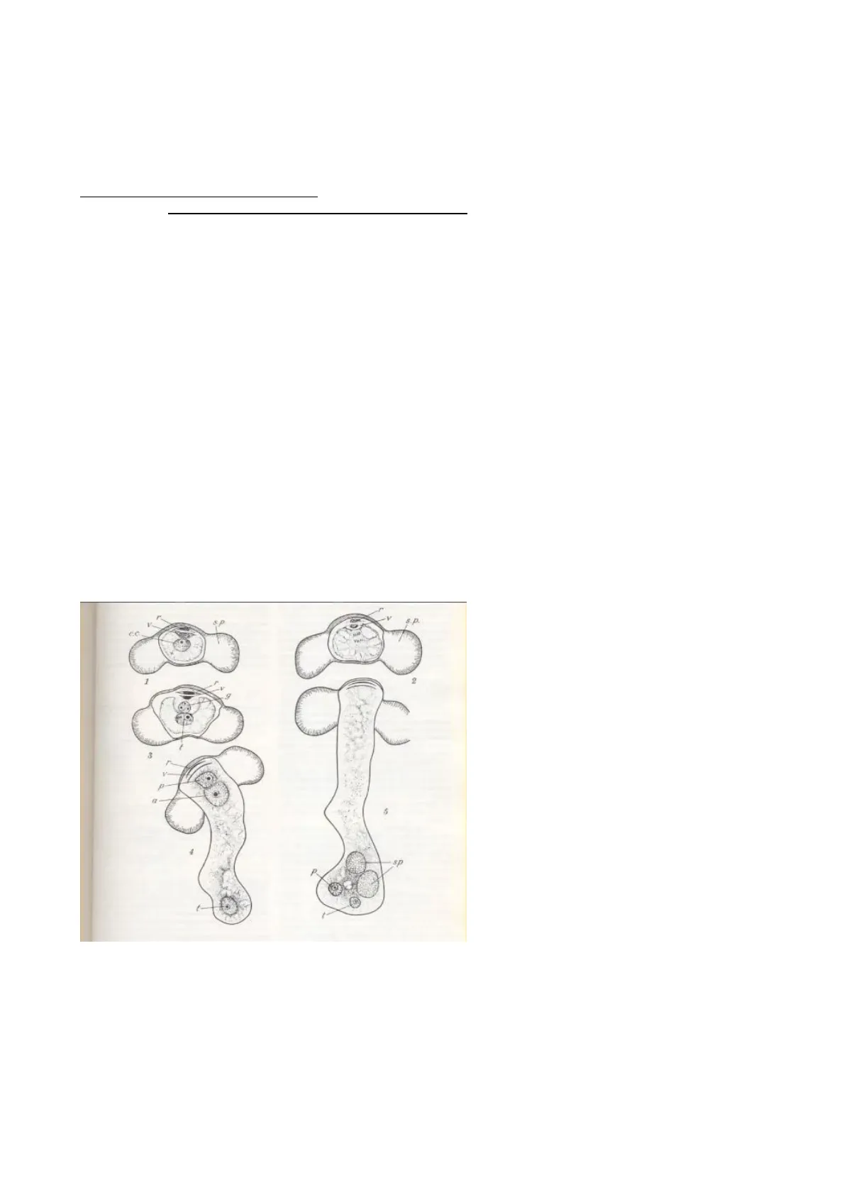 Superiormente, la lettera R indica una cellula che si chiama Rizoidale e la V indica una cellula che prende vari nomi, normalmente V sta per Vegetativa ma viene anche interpretata con il nome di Vestigiale. Le due cellule R e V non hanno nessuna particolare funzione, piano piano degenerano. Quando il polline viene liberato raggiunge la controparte femminile, lì si ferma e allora mentre la cellula Rizoidale e la Vegetativa non fanno niente, la Cellula Centrale subisce una prima mitosi. Molti la chiamano "prima mitosi aploide". Nella figura 3 abbiamo 4 cellule, ci sono ancora la R e la V e poi abbiamo una cellula indicata con la lettera G (cellula generativa o anteridiale) e una con la T (cellula del Tubetto, ha un abbondante citoplasma e va a formarequella lunga estroflessione che poi forma il tubetto pollinico con la quale il gametofito raggiunge la prossimità della cellula uovo).