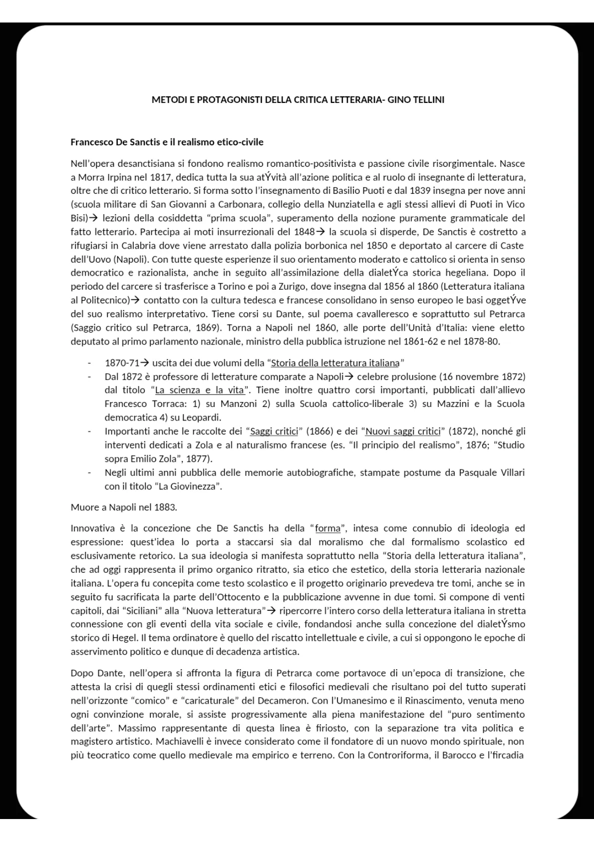 Documento di Università su Metodi e Protagonisti della Critica Letteraria. Il Pdf di Letteratura esplora le principali correnti della critica letteraria italiana, da Francesco De Sanctis alla scuola storica, al formalismo russo e alla critica stilistica.