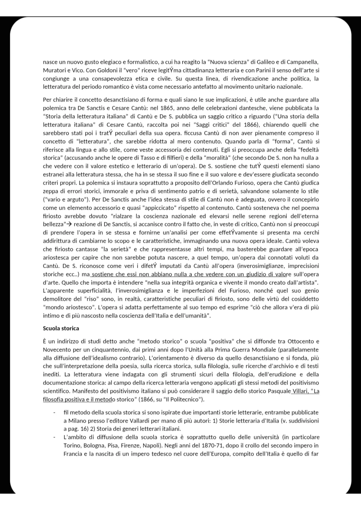 Nell'opera desanctisiana si fondono realismo romantico-positivista e passione civile risorgimentole. Nasce a Morra Irpina nel 1817, dedica tutta la sua atÝvità all'azione politica e al ruolo di insegnante di letteratura, oltre che di critico letterario. Si forma sotto l'insegnamento di Basilio Puoti e dal 1839 insegna per nove anni (scuola militare di San Giovanni a Carbonara, collegio della Nunziatella e agli stessi allievi di Puoti in Vico Bisi)-> lezioni della cosiddetta "prima scuola", superamento della nozione puramente grammaticale del fatto letterario. Partecipa ai moti insurrezionali del 1848-> la scuola si disperde, De Sanctis è costretto a rifugiarsi in Calabria dove viene arrestato dalla polizia borbonica nel 1850 e deportato al carcere di Caste dell'Uovo (Napoli). Con tutte queste esperienze il suo orientamento moderato e cattolico si orienta in senso democratico e razionalista, anche in seguito all'assimilazione della dialetÝca storica hegeliana. Dopo il periodo del carcere si trasferisce a Torino e poi a Zurigo, dove insegna dal 1856 al 1860 (Letteratura italiana al Politecnico)-> contatto con la cultura tedesca e francese consolidano in senso europeo le basi oggetÝve del suo realismo interpretativo. Tiene corsi su Dante, sul poema cavalleresco e soprattutto sul Petrarca (Saggio critico sul Petrarca, 1869). Torna a Napoli nel 1860, alle porte dell'Unità d'Italia: viene eletto deputato al primo parlamento nazionale, ministro della pubblica istruzione nel 1861-62 e nel 1878-80.