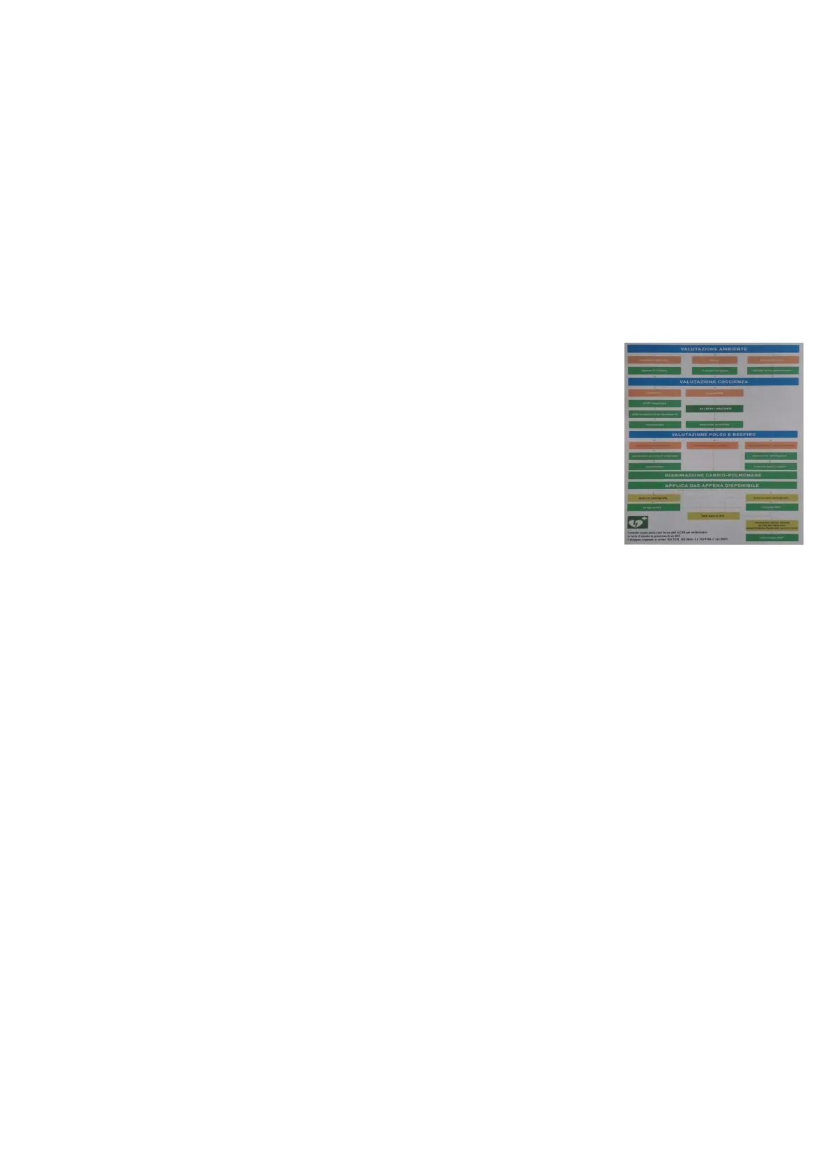 VALUTAZIONE POLSO E RESPIRO rivaluta ogni 2 minuti RIANIMAZIONE CARDIO-POLMONARE APPLICA DAE APPENA DISPONIBILE scarica nan consigliata riprendi REP