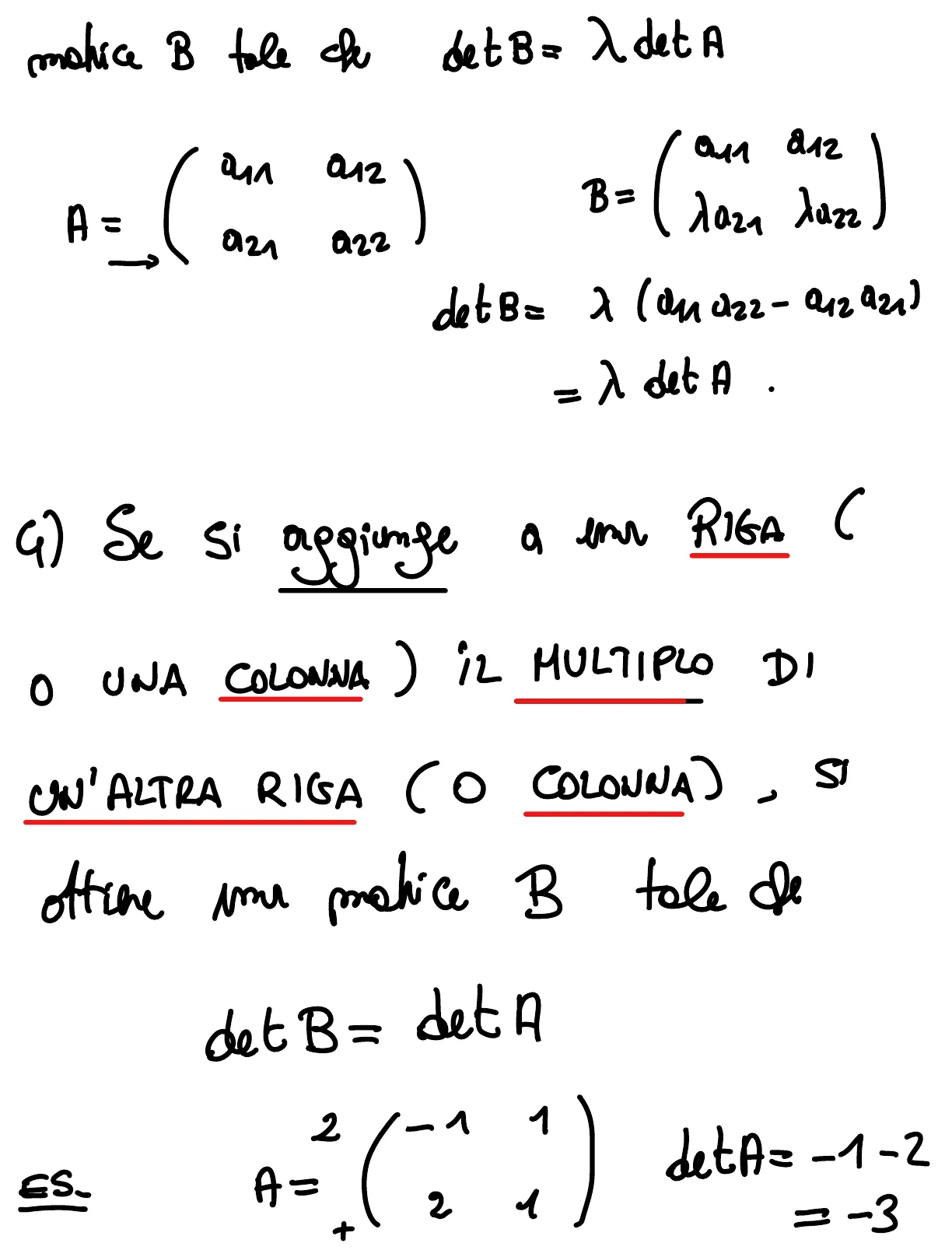 A & Mayo 1) Se due righe (o due colorme) di A Smo PROPORZIONALI (IN PARTICOLARE: UGUALI), det A = 0 A= (ia se) , DER : detA= lab-lab=0 2) Se si scambiano due righe (o deu calime) di A, si ottiene una matrice B tale che detB = - det A 3) Se si moltiplici ume riga (o una calima) di A per uno scalare 1 , Si ha unamatrice B tale che detB = > det A 41 012 A = - و ) 021 022 B= - daza daza) detB= x (un 02- 012 921) = > det A . 4) Se si aggiunge a una RIGA ( O UNA COLONNA) IL MULTIPLO DI UN'ALTRA RIGA ( O COLONNA) , SI ottiene uma matice B tale det B = det A detA =- 1-2 = - 3 2 A= + 1-1 1) 2 1 ES.J B= 03 detB =- 3
