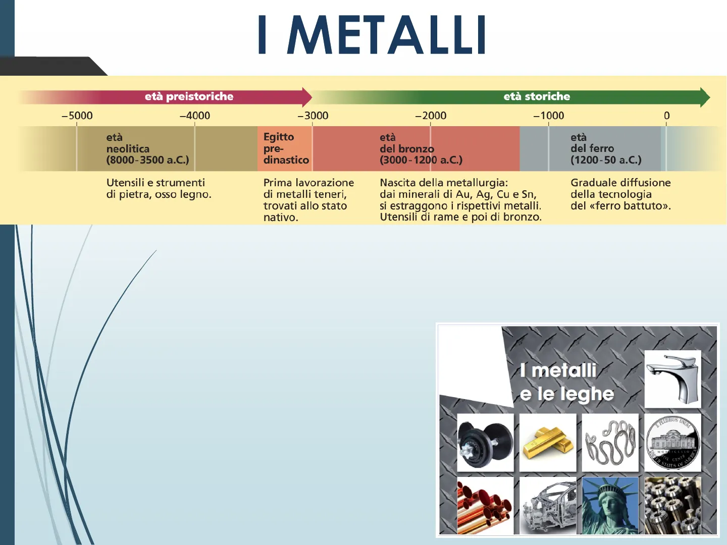 Gli storici hanno usato il nome di leghe e metalli per distinguere le grandi epoche dell' umanità: età del rame, età del bronzo, età del ferro.