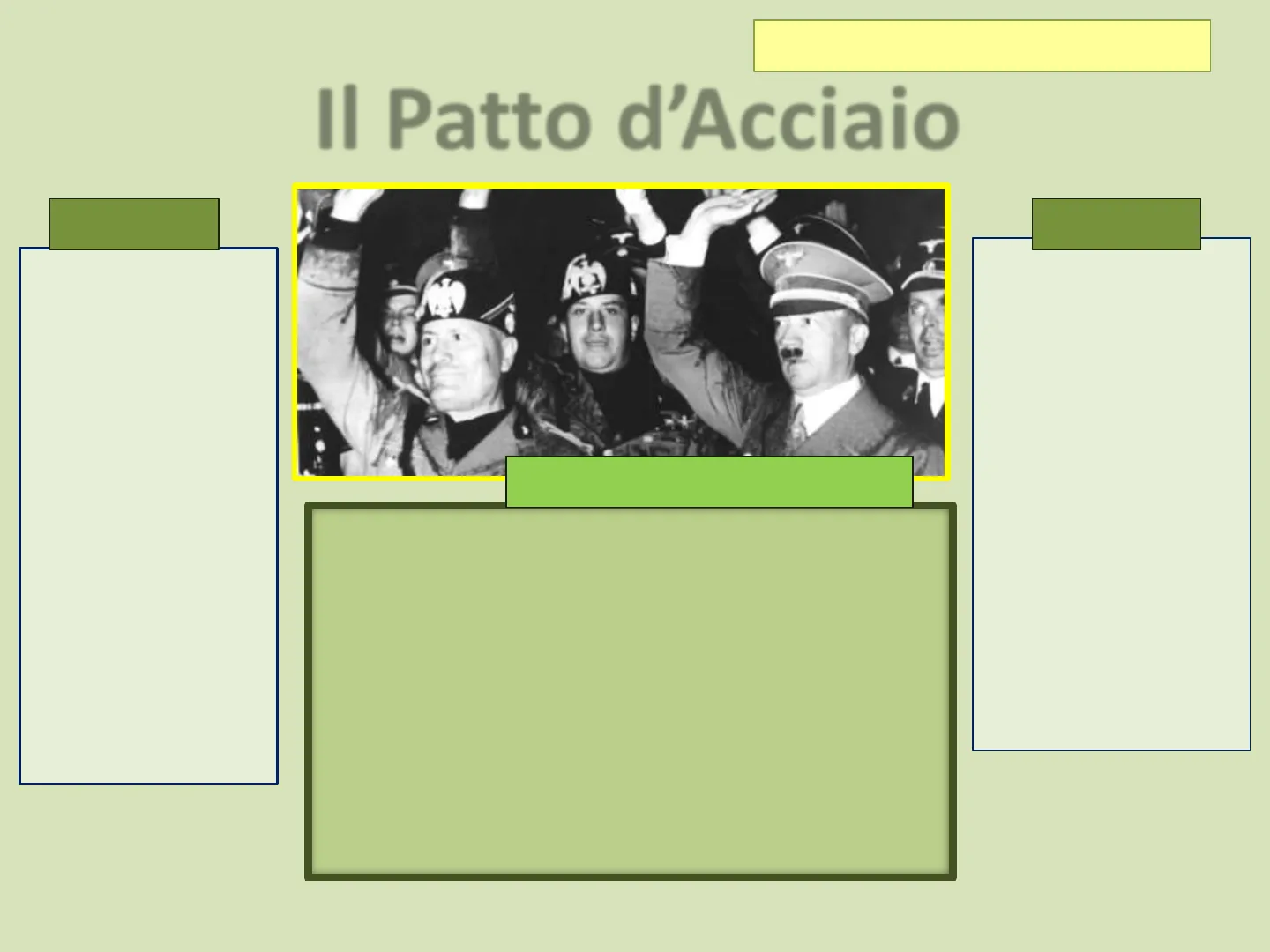 IL Patto d'Acciaio tra Mussolini e Hitler fu stretto nel maggio 1938. Si impegnarono a sostenersi in caso di guerra (difensiva e offensiva). Le mire espansionistiche erano già evidenti: l'Italia aveva già conquistato Etiopia e Albania.