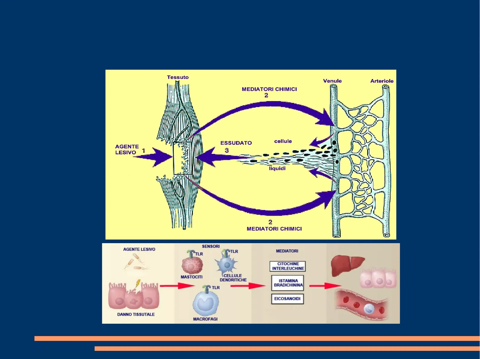 EVENTI DELL'INFIAMMAZIONE Tessuto Venule Arteriole MEDIATORI CHIMICI 2 ESSUDATO AGENTE LESIVO 1 3 liquidi 2 MEDIATORI CHIMICI SENSORI AGENTE LESIVO PTLR MEDIATORI ‘TLR CITOCHINE INTERLEUCHINE MASTOCITI CELLULE DENDRITICHE ISTAMINA BRADICHININA TLR EICOSANOIDI DANNO TISSUTALE MACROFAGI celluleMediatori chimici dell'infiammazione I mediatori chimici dell'infiammazione possono essere suddivisi in 2 gruppi principali mediatori di origine cellulare mediatori plasmatici I mediatori di origine cellulare a loro volta si distinguono in mediatori · preformati · di neo-sintesi Caratteristica generale di tutti i mediatori è la loro vita molto breve decadono rapidamente o vengono inattivati da sistemi enzimatici specifici Il controllo dell'attività dei mediatori dell'infiammazione è fondamentale allo scopo di limitare il danno che molti di essi potrebbero determinare a carico dei tessuti dell'ospite