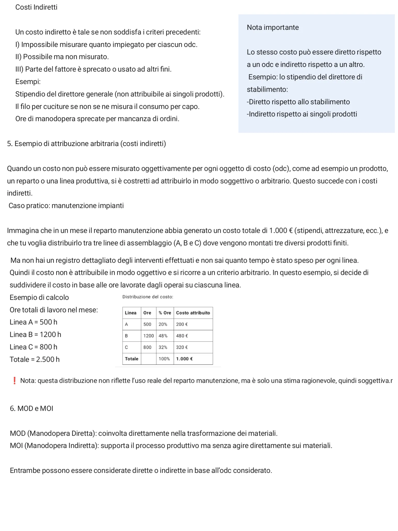 Immagina che in un mese il reparto manutenzione abbia generato un costo totale di 1.000 € (stipendi, attrezzature, ecc.), e che tu voglia distribuirlo tra tre linee di assemblaggio (A, B e C) dove vengono montati tre diversi prodotti finiti. Ma non hai un registro dettagliato degli interventi effettuati e non sai quanto tempo è stato speso per ogni linea. Quindi il costo non è attribuibile in modo oggettivo e si ricorre a un criterio arbitrario. In questo esempio, si decide di suddividere il costo in base alle ore lavorate dagli operai su ciascuna linea.
