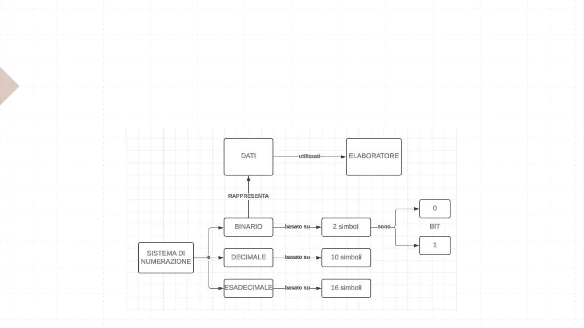 DATI utilizzati- ELABORATORE RAPPRESENTA 0 BINARIO basato su- 2 simboli sono- BIT 1 SISTEMA DI NUMERAZIONE DECIMALE basato su 10 simboli ESADECIMALE basato su- 16 simboli