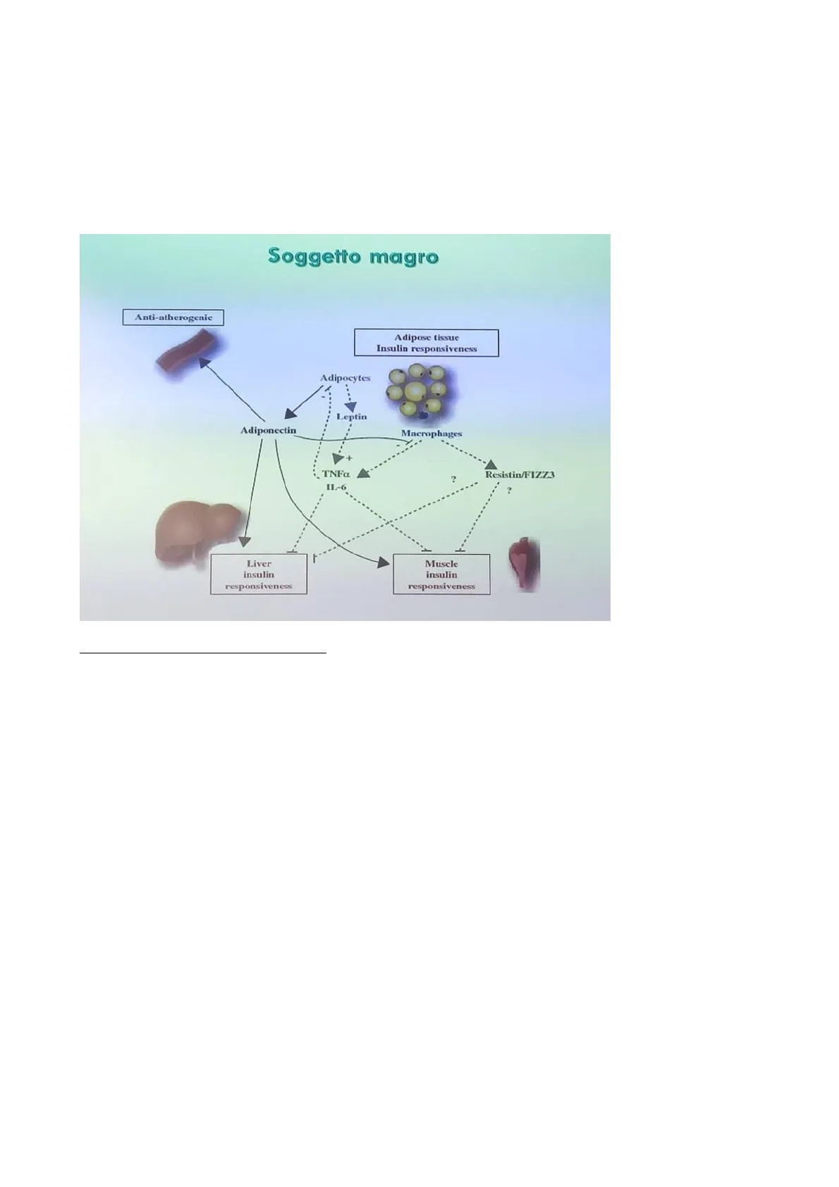 Lezione 2 (17/12/24) ore 9.00-11.00 Prof. Arturi Soggetto magro Anti-atherogenic Adipose tissue Insulin responsiveness Adipocytes Leptin Adiponectin Macrophages TNFa IL-6 ? Resistin/FIZZ3 Liver insulin responsiveness Muscle insulin responsiveness