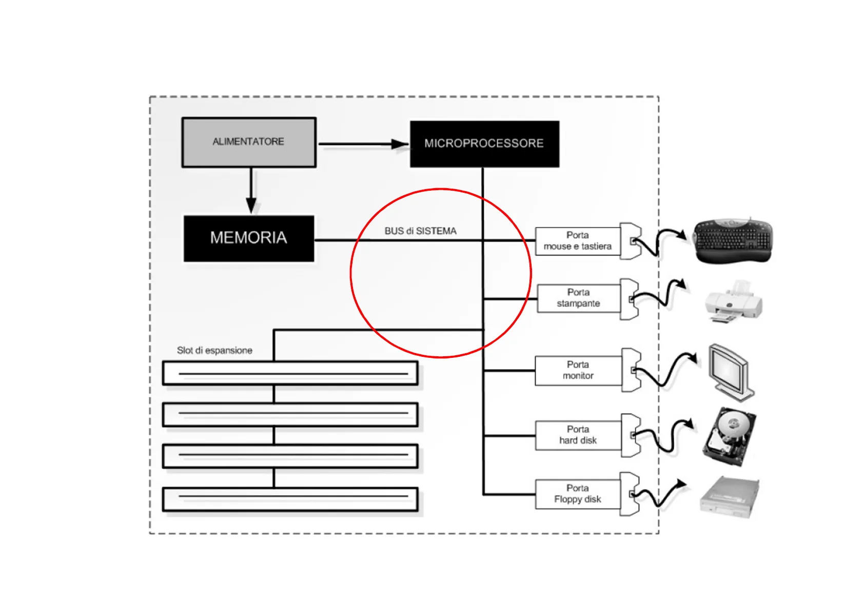 ALIMENTATORE MICROPROCESSORE BUS di SISTEMA MEMORIA Porta mouse e tastiera Porta stampante Slot di espansione Porta monitor Porta hard disk Porta Floppy disk JInterfacce di I/O