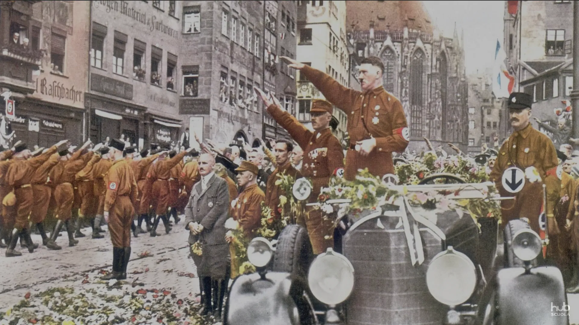 hub SCUOLAIL NAZISMO E LA CRISI DEGLI STATI LIBERALI/LA CRISI DELLA GERMANIA FAVORISCE L'ASCESA DEL NAZISMO Iniziano ad emergere movimenti nazionalisti e partiti antidemocratici di destra: reclamano un governo autoritario che restituisca al Paese la grandezza passata. Adolf Hitler, il leader del Partito nazionalsocialista dei lavoratori tedeschi, o Partito nazista, promette di ristabilire l'ordine e la potenza della Germania.