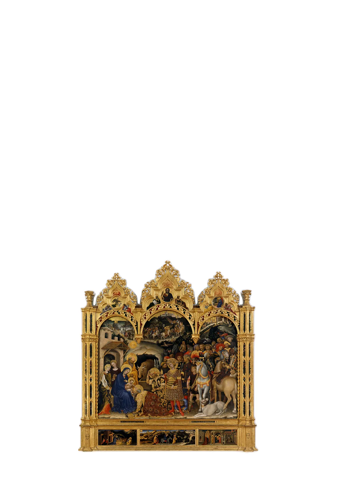 Nella pala di Gentile sono raffigurati i tre re Magi che portano i loro doni a Gesù Bambino seguiti da un lungo corteo. I Magi sono presenti per ben quattro volte: la prima a sinistra mentre avvistano la cometa, la seconda al centro durante il viaggio, la terza a destra alle porte di Betlemme e la quarta in primo piano. Il racconto evangelico è un pretesto per poter rappresentare la ricchezza e lo sfarzo della famiglia. Tutto è rappresentato con una minuzia di particolari, che fa sembrare ogni elemento a sé stante. Gentile preferisce alla visione d'insieme la somma di tante viste parziali. Gli elementi sono decorativi. Per esempio, gli abiti dei Magi sono realizzati in prezioso broccato (seta) trapunto d'oro. Nella scena compare anche Palla Strozzi, che indossa un particolare copricapo. Cerca di rendere l'idea di profondità usando diverse altezze per rappresentare i personaggi. Il corteo, infatti, non voleva dare senso di profondità, ma era l'espediente per rappresentare più personaggi e quindi più abiti. Questa tavola fu dipinta nel 1423, quando la prospettiva era quindi già stata scoperta. Lui decide di non usarla perché era legato al gotico internazionale. Sulla destra inserisce un cavallo rappresentato in scorcio prospettico visto da dietro, ma la posa non è comunque molto naturale. Nel dipinto sono presenti vari animali esotici: