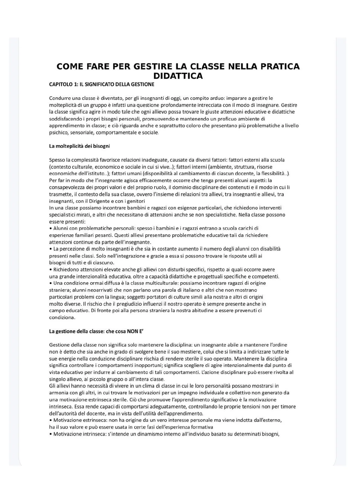 Documento sulla gestione della classe nella pratica didattica. Il Pdf, di Psicologia per l'Università, esplora il significato della gestione della classe, la molteplicità dei bisogni degli alunni, la motivazione, l'organizzazione dell'ambiente aula e la didattica inclusiva per DSA.
