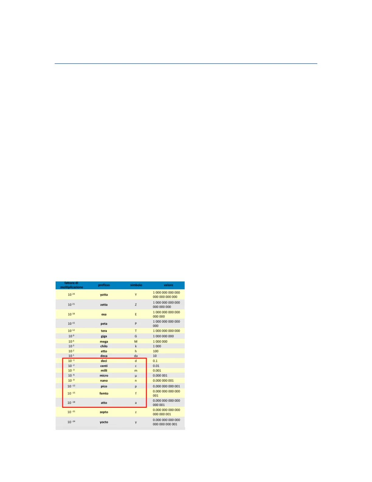 fattore di moltiplicazione prefisso simbolo valore 10 24 yotta Y 000 000 000 000 10 21 zetta Z 1 000 000 000 000 000 000 000 1 000 000 000 000 10 18 exa E 000 000 10 15 peta p 000 10 12 tera T 1 000 000 000 000 10 º giga G 1 000 000 000 10 € mega M 1 000 000 103 chilo k 1 000 102 etto h 100 10 deca da 10 10-1 dec d 0.1 10-2 centi C 0.01 10-3 milli m 0.001 10 -6 micro 1 0.000 001 10 -9 nano 0.000 000 001 10 -12 pico a 0.000 000 000 001 10 -15 femto f 0.000 000 000 000 001 10-18 atto 2 0.000 000 000 000 000 001 10 -21 zepto 7 0.000 000 000 000 000 000 001 0.000 000 000 000 10 -24 yocto V 000 000 000 001 1 000 000 000 000