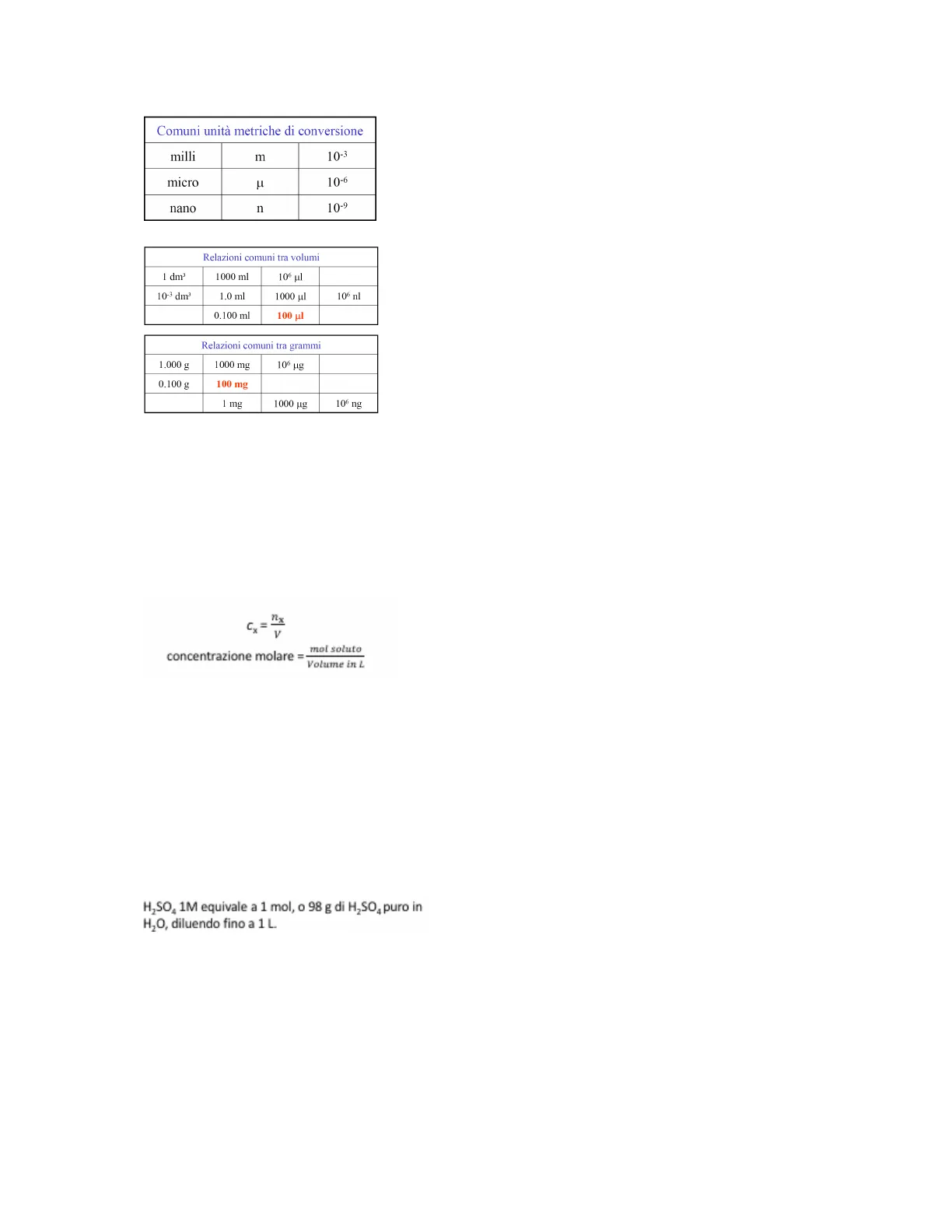La concentrazione molare cx della soluzione della specie chimica X è il numero di moli di quella specie contenuto in un litro di soluzione (non in un litro di solvente). In termini del numero di moli di soluto, n, e del volume di soluzione, V, si può scrivere mol soluto concentrazione molare =- Volume in L L'unità di misura della concentrazione molare è la molarità, M, che ha le dimensioni di mol/L, o mol L-1. Esprime anche il numero di millimoli di soluto per millilitro di soluzione. La concentrazione molare si può esprimere in due modi. ·Concentrazione molare analitica (numero di moli di soluto totali, indipendentemente da ciò che accade in soluzione). · Concentrazione molare di equilibrio (numero di moli di una particolare specie in una soluzione all'equilibrio). ·Concentrazione molare analitica ... indipendentemente da ciò che accade in soluzione H2SO4 1M equivale a 1 mol, o 98 g di H2SO4 puro in H2O, diluendo fino a 1 L. ·Concentrazione molare di equilibrio ... in una soluzione all'equilibrio La concentrazione molare di equilibrio di H2SO4 in una soluzione avente una concentrazione analitica 1M è in realtà 0! Questo perché l'acido solforico è completamente dissociato in una miscela di H+, HSO4meno ed SO4 2-con le rispettive concentrazioni di equilibrio 1,01; 0,99; 0,01 M.