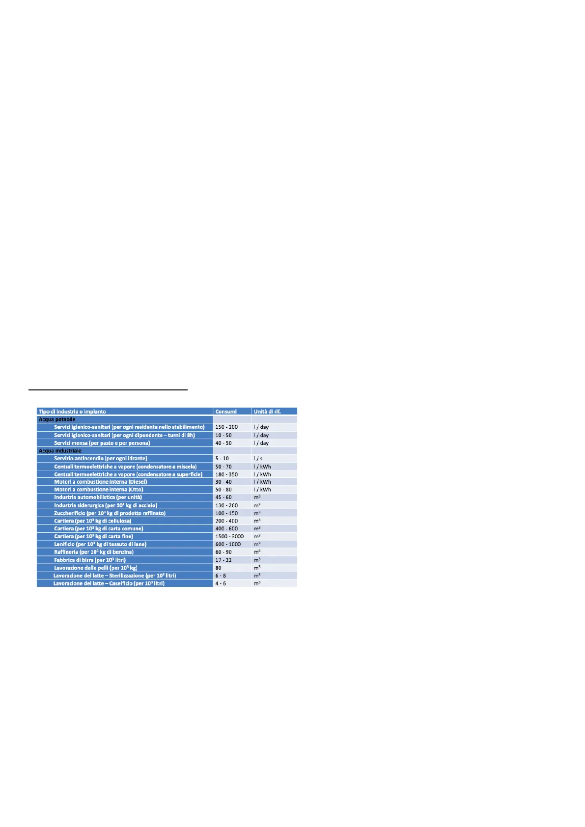 Tipo di industria o impianto Consumi Unità di rif. Acqua potabile Servizi igienico-sanitari (per ogni residente nello stabilimento) 150 - 200 1 / day Servizi igienico-sanitari (per ogni dipendente - turni di 8h) 10 -50 1 / day Servizi mensa (per pasto e per persona) 40 - 50 1 / day Acqua industriale Servizio antincendio (per ogni idrante) 5 - 10 I/ s Centrali termoelettriche a vapore (condensatore a miscela) 50 - 70 1 / kWh Centrali termoelettriche a vapore (condensatore a superficie) 180 - 350 1 / kWh Motori a combustione interna (Diesel) 30 - 40 1 / kWh Motori a combustione interna (Otto) 50 - 80 1 / kWh Industria automobilistica (per unità) 45 - 60 mª Industria siderurgica (per 103 kg di acciaio) 130 - 260 m3 Zuccherificio (per 103 kg di prodotto raffinato) 100 - 150 m3 Cartiera (per 103 kg di cellulosa) 200 - 400 m3 Cartiera (per 103 kg di carta comune) 400 - 600 m3 Cartiera (per 103 kg di carta fine) 1500 - 3000 m3 Lanificio (per 103 kg di tessuto di lana) 600 - 1000 m3 Raffineria (per 103 kg di benzina) 60 - 90 m3 Fabbrica di birra (per 103 litri) 17 - 22 m3 Lavorazione delle pelli (per 103 kg) 80 m3 Lavorazione del latte - Sterilizzazione (per 103 litri) 6-8 m3 Lavorazione del latte - Caseificio (per 103 litri) 4- 6 m3