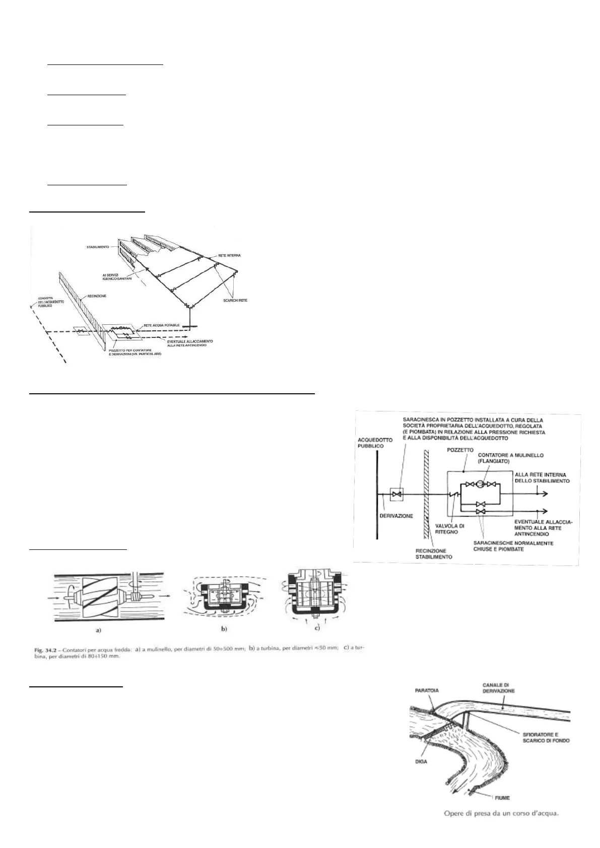 Dall'acquedotto si diparte una derivazione. Portata e pressione sono regolate dalla saracinesca installata fuori della recinzione dello stabilimento. In un pozzetto interno alla recinzione, è presente un contatore dell'acqua (alcuni tipi sono sotto rappresentati), per consentire al gestore della rete di emettere le fatture all'utente. Il ramo in parallelo al contatore (detto «bypass») è utilizzato quando il contatore è sotto manutenzione. SARACINESCA IN POZZETTO INSTALLATA A CURA DELLA SOCIETÀ PROPRIETARIA DELL'ACQUEDOTTO, REGOLATA (E PIOMBATA) IN RELAZIONE ALLA PRESSIONE RICHIESTA E ALLA DISPONIBILITÀ DELL'ACQUEDOTTO ACQUEDOTTO PUBBLICO POZZETTO CONTATORE A MULINELLO (FLANGIATO) ALLA RETE INTERNA DELLO STABILIMENTO DERIVAZIONE VALVOLA DI RITEGNO EVENTUALE ALLACCIA- MENTO ALLA RETE ANTINCENDIO SARACINESCHE NORMALMENTE CHIUSE E PIOMBATE RECINZIONE STABILIMENTO Fig. 34.2 - Contatori per acqua fredda: al a mulinello, per diametri di 50e500 mm; b) a turbina, per diametri «50 mm; c) a tur- bina, per diametri di 80+150 mm.