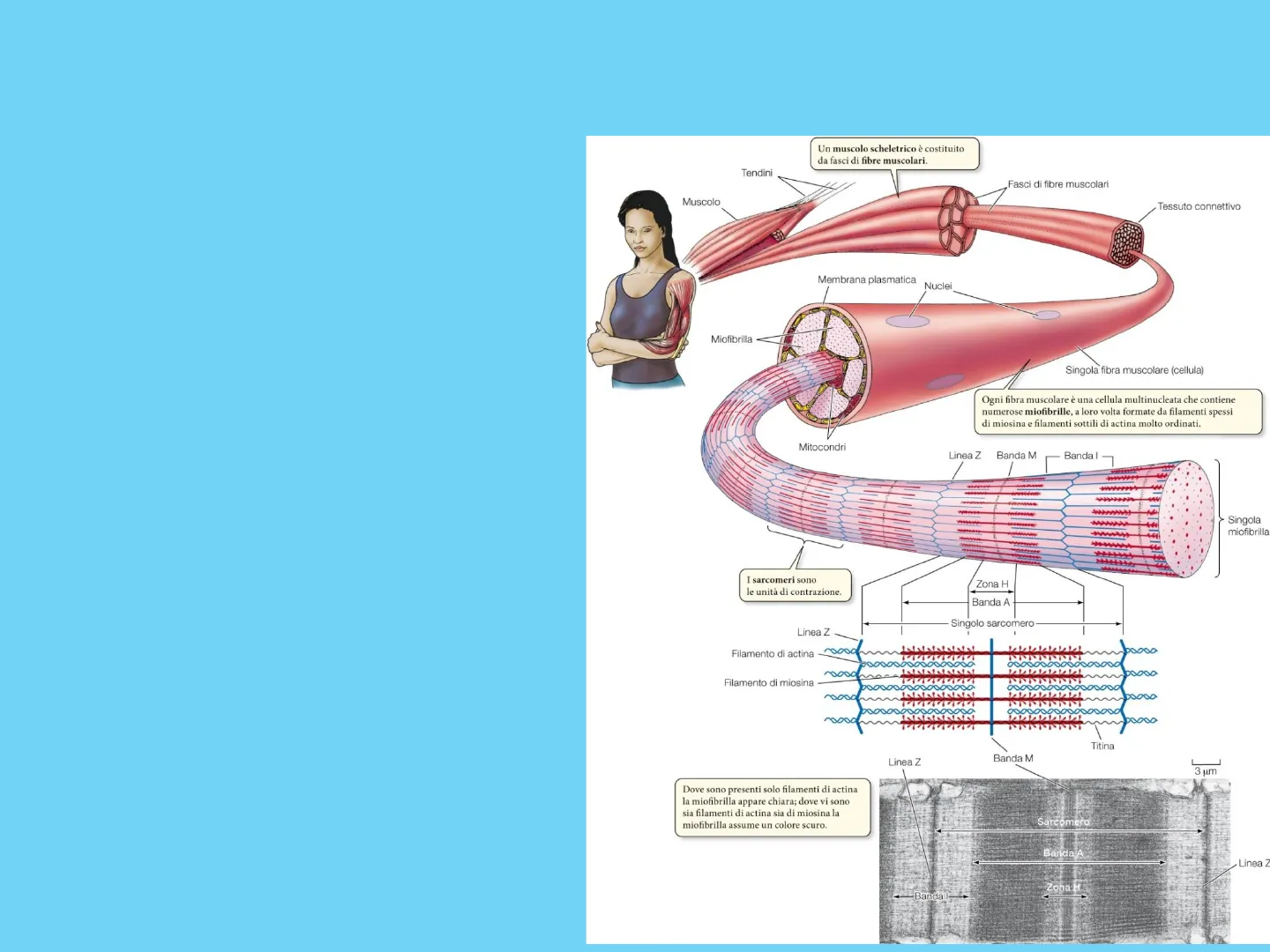 Ogni fibra muscolare è una cellula multinucleata che contiene numerose miofibrille, a loro volta formate da filamenti spessi di miosina e filamenti sottili di actina molto ordinati.